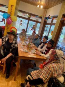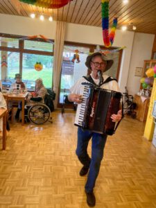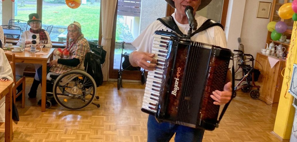 Für die musikalische Begleitung sorgte Gerd mit seinem Akkordeon: Es wurde eifrig mitgesungen, eine Polonaise durchs Haus getanzt und beim Fasnachtshit „Gute Laune“ waren alle mit schwungvollen Bewegungen dabei.