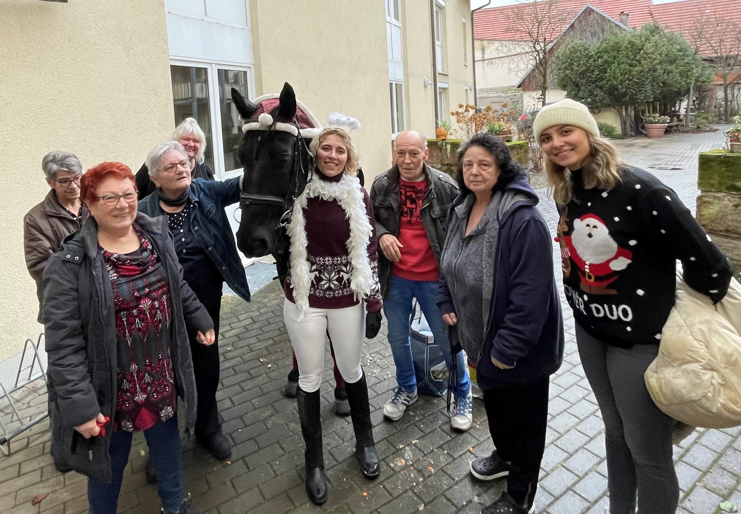 Zum Abschluss der Vorweihnachtszeit besuchte uns am Freitag, wie jedes Jahr, Sigur „unser“ Weihnachtspferd. Hübsch dekoriert kommt der geduldige Wallach in unseren Innenhof geritten und kann von den Bewohnern gefüttert und mit Streicheleinheiten verwöhnt werden. Das Zusammentreffen und Begegnen von Tier und Mensch genießen alle und tut beiden Seiten gut.